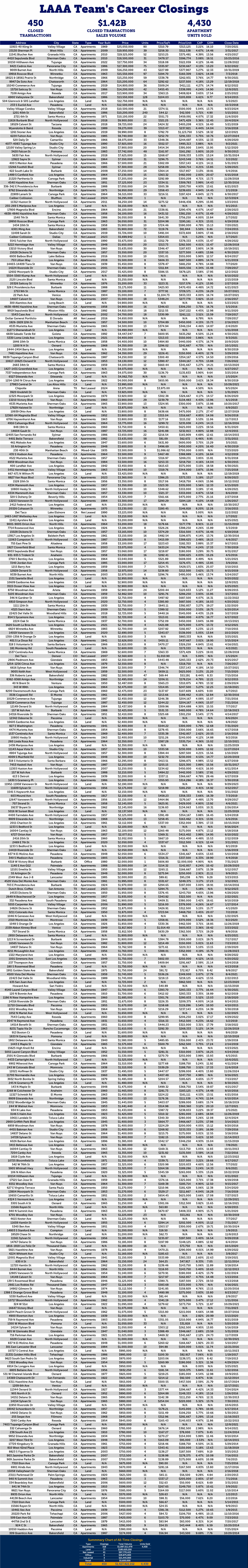 455+ transactions totaling over $1.45B+ in sales volume since 2013, across 140+ neighborhoods in Los Angeles County and beyond.